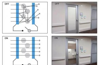 智能調光玻璃也叫電控調光玻璃,能夠通過電來控制玻璃的透明度。主要工作原理是在玻璃之間加裝一層液晶調光膜(PDLC)。